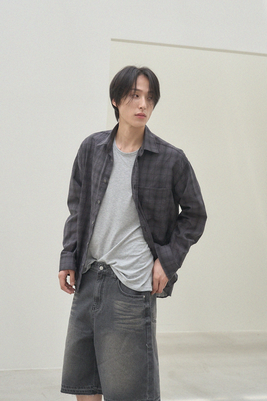 이번 화보에서는 자연스러운 포즈와 도시적인 배경을 통해 체크셔츠의 다양한 매력과 활용성을 표현하고자 했습니다.
